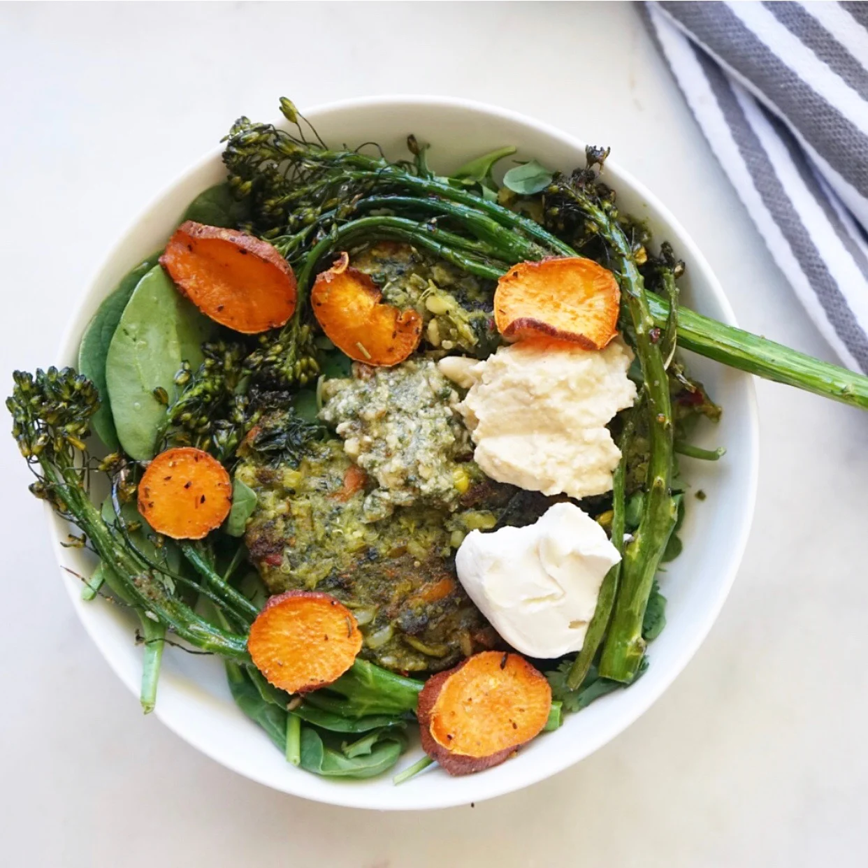 - While you're waiting for your veggies to roast, cook a veggie burger of your choice on the stove top in a little bit of avocado or coconut oil! Flip and cook the other side, and scoop it into your bowl! I love Dr. Praegers or Hilary's veggie burgers! Add it on top of the greens